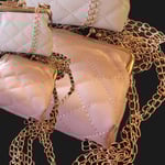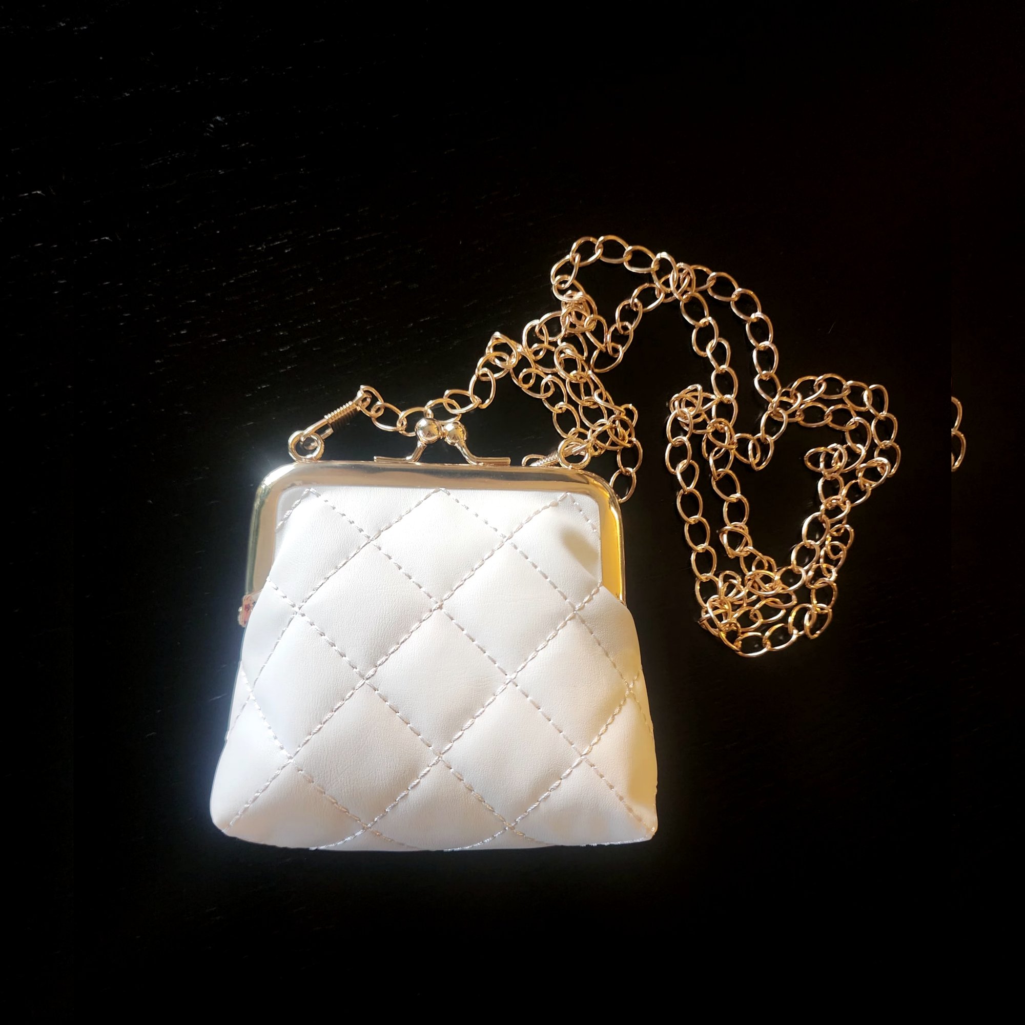 The ideal accessory to brighten up your look and keep everything you need right at hand. Available in cream or white colors with goldtone chain